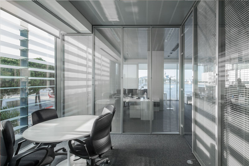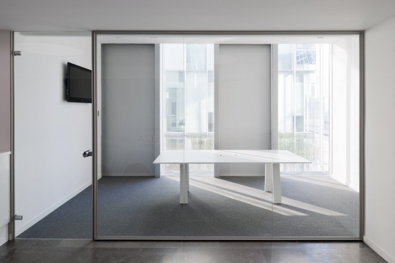 Sistema de divisória sem estrutura vertical. É composto por 2 ou 4 perfis aplicados na horizontal; Pavimento e Tecto ou, parte superior da divisória consoante características próprias da obra ou da solução estética a adoptar. O cerramento é garantido pela aplicação do vidro em justaposição em topos e cantos e, as juntas isoladas com perfil próprio em policarbonato transparente. Maior entrada de luz em zonas de opacidade. Especialmente indicada para “ilhas” em espaços de distância acentuada a fontes de luz natural. Esta divisória permite resultados estéticos de elevada qualidade.